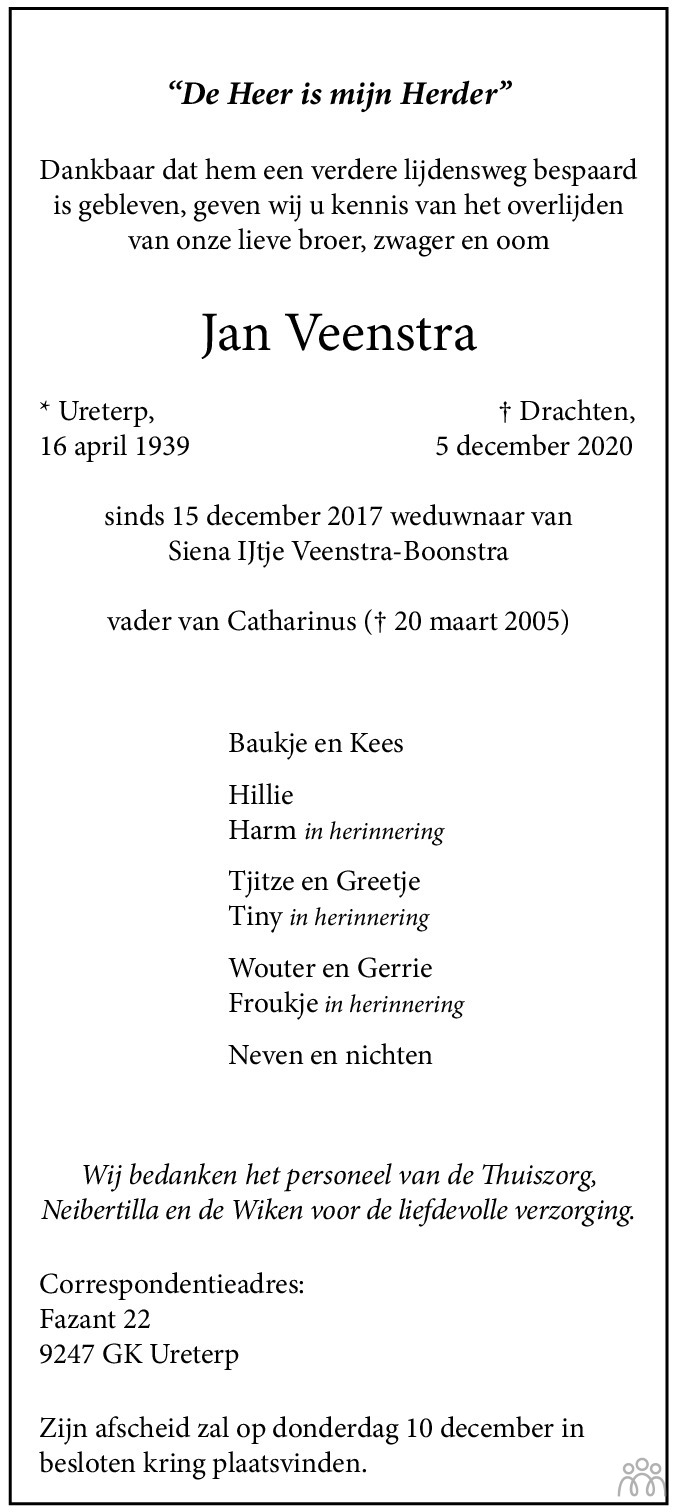 Jan Veenstra 05 12 2020 Overlijdensbericht En Condoleances Mensenlinq Nl
